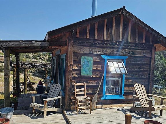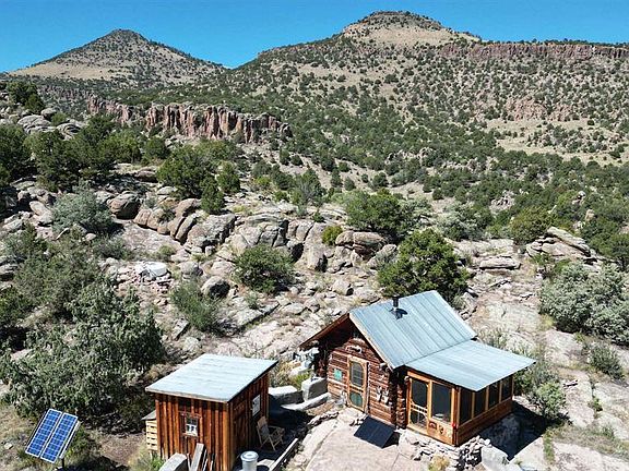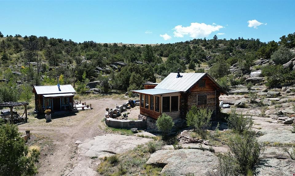 Tucked into the rugged Limekiln area just 10 miles southwest of Del Norte, this one-of-a-kind off-grid retreat is calling the explorer in you. Built by hand in 2005 from locally harvested lumber, the 168 sq ft main cabin is the heart of this 30-acre homestead—surrounded by National Forest with no neighbors in sight. Privacy and adventure are guaranteed. Step inside and you’ll find a cozy log interior with exposed beams, a wood-burning stove, a lofted sleeping space, and a cheerful kitchen featuring a propane stove, farmhouse sink, copper water vessel, and a solar-powered refrigerator. A screened-in porch adds another 80 sq ft, perfect for morning coffee while you watch deer wander through the pinons. Across the yard sits the “bunkhouse,” a 100 sq ft guest cabin with built-in bunks, an outdoor kitchen, and its own front porch—a perfect spot for stargazing. The bath house is rustic yet comfortable, with a manually composting toilet, propane camp shower, and small heater to keep things warm on frosty mornings. Both cabins run on simple, efficient systems—wood heat, propane appliances, and solar power—making this the ultimate mountain basecamp. Explore miles of National Forest trails right from your doorstep, or just kick back by the outdoor fire ring and soak in the silence. A modern, solar-powered water well is located on the property at the base of the driveway. Drilled in 2005, this well is 214 feet deep and has a sustained pump rate of 3 gallons per minute. A buried, 500-gallon cistern keeps plenty of water on hand year-round. Water can be hauled to the cabins in a trailer-mounted cistern, or in 3-5 gallon water jugs, whichever you prefer. Several good home sites sit lower on the property and closer to the well. If you'd like to build a more traditional home with a well and septic, this is still the place you want to be! This historic 160-acre mining claim is subdivided into 11 separate parcels, but with no other cabins built on any of them, it feels like you have the mountains all to yourself. Although the road is not maintained year-round, you do have access through the Forest Service gates even during seasonal closures. Adding to the property's rich character, a historic lime kiln lies within sight of the cabin. In the 1800s, lime was made here by heating local travertine in stone kilns at temperatures of 1,600–1,800°F, producing quicklime used for mortar, plaster, and whitewash in the rapidly growing town of Del Norte. In the late 1800s, Del Norte briefly entered the conversation as a possible capital of Colorado. Located near the geographic center of the southern Rockies and thriving from mining, ranching, and trade, the town’s advocates argued it was a natural hub for the state. This historic lime kiln site provided much of the materials needed for the rapid building in Del Norte during that time. This visible remnant of Colorado’s frontier history connects these cabins to the area’s early industry and gives your land a story as enduring as the mountains themselves.