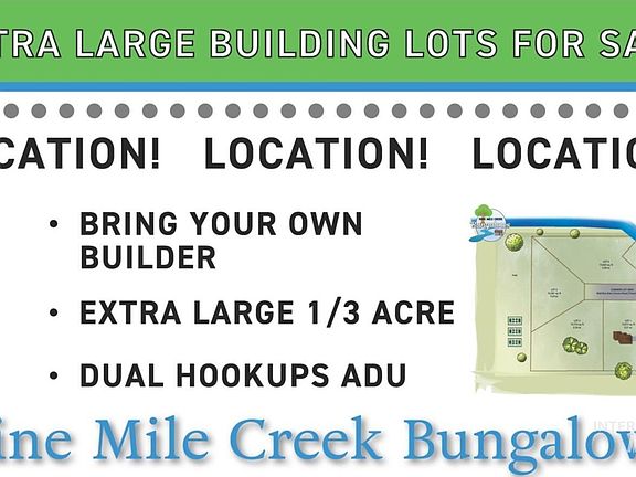 THIRD ACRE BUILDING LOT, bring your own builder. Build Your Dream House Here! BRAND NEW NEIGHBORHOOD, Large Building Lot which backs up to waterway of Nine Mile Creek. Dreamy Meridian location. Wide Open Views. Back yard faces north. Expansive Third Acre Lot. One buildable lot which includes option for ADU accessory dwelling unit. .375 acres in size. Dual hook ups for water, sewer, power, natural gas. Excellent location. Close to schools, hospital, and shopping. Very spacious building lot. Basements are allowed. Short term rentals are allowed. Nine Mile Creek Bungalows is a neighborhood of 4 large homesites. Situated beside private park and tennis courts of Sportsman Point Subdivision. Final plat is complete. Rare opportunity to find nice buildable lot in town with amazing features. Ready to go, break ground today.