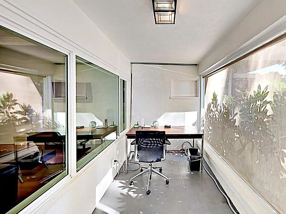 Enclosed porchPrivate enclosed porchShared backyard patioQueen bedModern tableShared patio spaceBright finishes