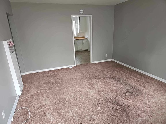 Tile floors in bathroomMirror medicine cabinetOpen floor planWhite appliancesPlush brown carpetFormica counter-topsTile floors in kitchen