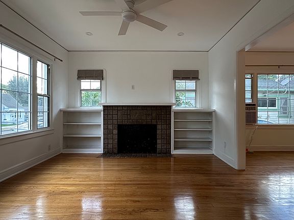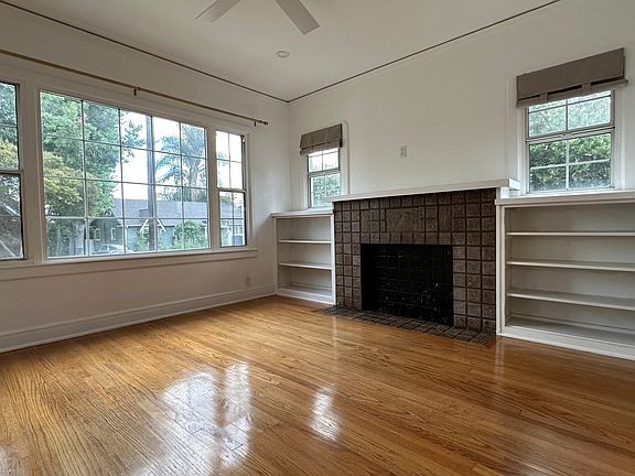 Original batchelder tile fireplaceHex tile floorsRestored hardwood floorsRestored vintage kitchenNewly updated bathroomOriginal built-insMarble vanity