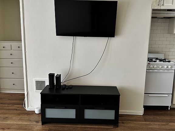 Entertainment tableNice bathroomLarge windowsLarge spacious roomBath tubStrong window ac unitLarge fridge