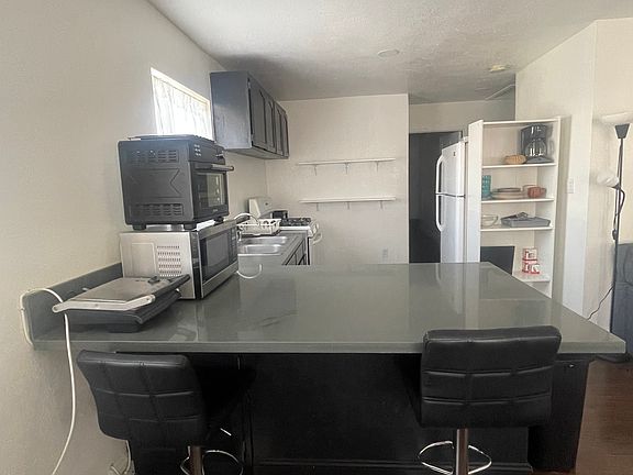 Kitchen with appliances - fridge, stove, microwave, air fryer, panini press & coffee maker - and more cookware, plates and bowls & barstools included.