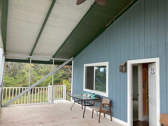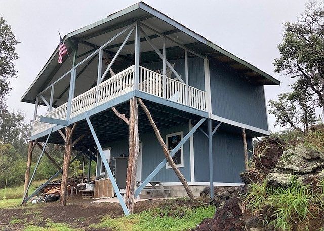 Brand New 896 sq. ft. unpermitted house with huge 512sq. ft. covered lanai on lovely forested lot with partial ocean views. You will love the peaceful atmosphere here with birdsong and total privacy. This lot was carefully cleared for the existing house and additional clearing for future workshop or garage saving the trees and the natural terrain. Although it was built without permits it is full of quality touches. This house has 2 bedrooms, an office or family room, 2 full baths, and a kitchen. 2 stories with both interior and exterior staircases. There is a 3600 gallon catchment tank and heavy duty Furman Tri-Fuel 7500 watt generator. Builder is just finishing up with construction. Come see this sweet cabin in the woods. You may never want to leave...