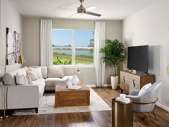 Model Home. The Lush Package offers white cabinets with Moon White Granite countertops, 6"x36" Vicinity Brown large wood-like tile flooring, and gray beige tweed carpet.