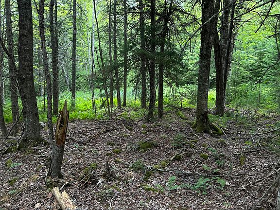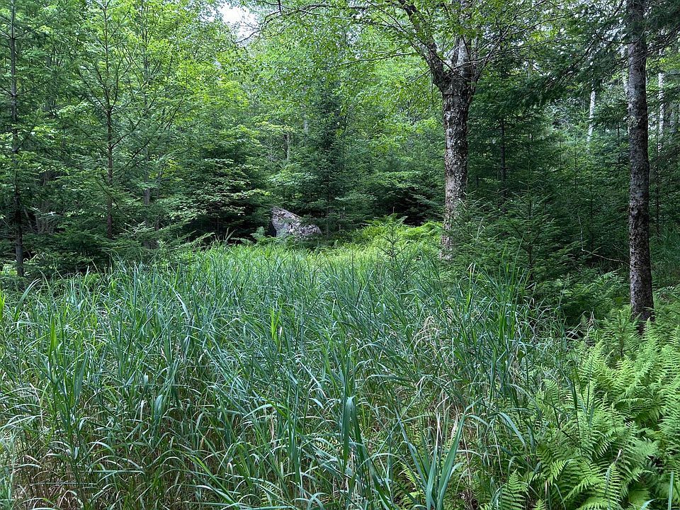Beyond the clearing, the lot is wooded with a balanced mix of deciduous and evergreen species, providing year-round cover and varied habitat. To the west, an unnamed stream flows along the property edge—visible from several points on the lot and offering quiet, natural interest without the complications of a waterfront build.