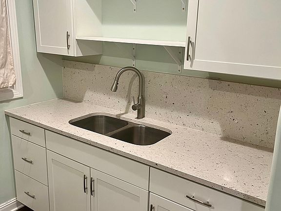 Quartz countersKitchen with convection microwaveRemodeled studio apartment