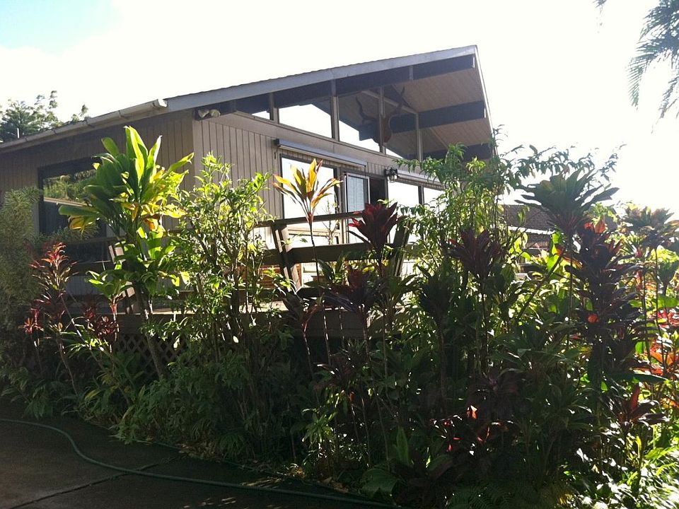 Large backyard with lanaiVaulted high-beamed ceilingsMature fruit treesRaised gardens