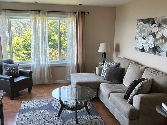 This tri-level home has 1,400 square feet of space with three bedrooms and two and a half bathrooms. It's designed with traveling professionals, remote workers, and small groups or families in mind, plenty of room to spread out, reset, and stay productive or relaxed. The main (middle) level is open and bright, with large windows that pull in natural light and views. The living room is cozy and ready for downtime, with a plush couch, reading chair, smart TV, and an electric fireplace built into a console.