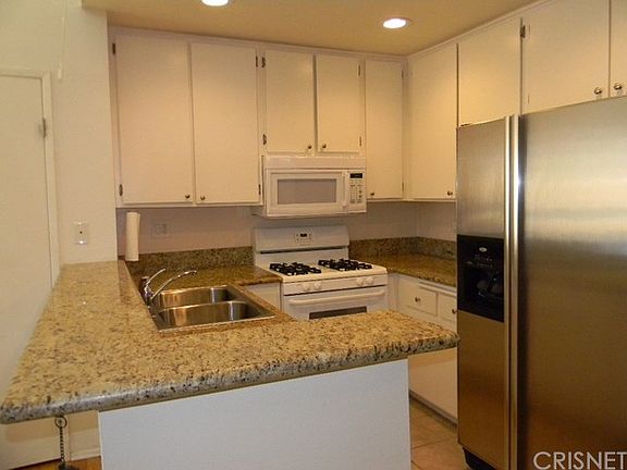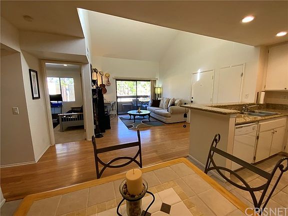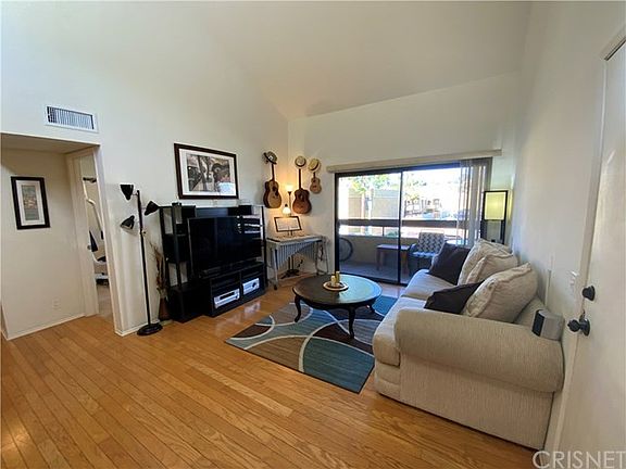 Welcome Home to this beautifully upgraded, upper lever condo, with spacious vaulted ceilings and crown moldings! Lovingly cared for the seller has upgraded the kitchen and bathrooms with granite countertops, and installed wood flooring in the living areas. The master bedroom is quite large and has a Big walkin closet and en suite bathroom. There is a large balcony to sit and enjoy the neighborhood views, and have your BBQ. This is a lovely area to live and within walking distance to shopping, theaters, restaurants but still situated in a nice quiet neighborhood. There are 2 assigned covered parking places, nice green belts, a sparkling pool and spa. Trash and the water is included in the HOA dues. Clearly at this price, the Best value in town!!