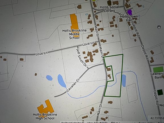 7+ Acre in-town Hollis lot with 500+ feet of road frontage. Across from Hollis Brookline High School and in close proximity to Hollis Brookline Middle School and a short distance to Hollis Town Hall, restaurants, shopping and well regarded farm stands! This lot is in the Historic District and the building designs need to be approved by the Hollis Historic District Commission.This property has recently been used by a local farm for agricultural purposes and for that reason has received a tax reduction. Great subdivision potential.