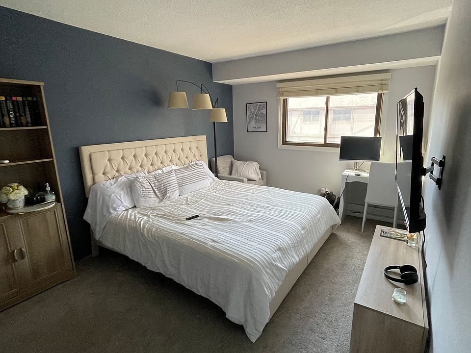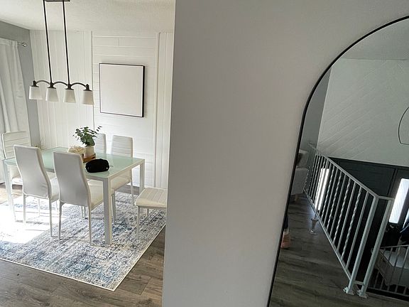 Furniture included is King Bed ensemble with storage, full sized bed, mounted primary bedroom 55" television, couch, dining room & patio furniture, and lighting. Flexible move in date is December or January.