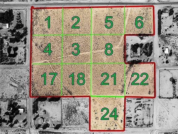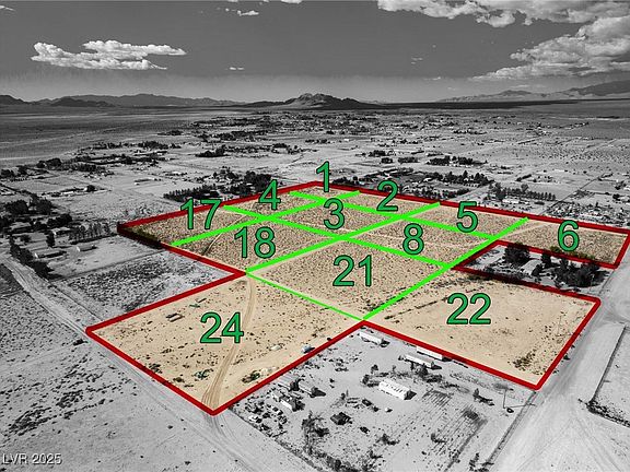 The National Enquirer doesn't know about this spectacular piece of dirt in the quiet community of Sandy Valley. A total of 24.35 acres on 12 parcels off of Marble Ave (asphalt) with one or more parcels with other road access for multiple entry and exits if desired. One parcel has a well, electricity is close by. This would make for a great horse property! Call and for a lender who can lend on the property. Not in open range, close enough to Las Vegas but far enough for tranquility. Numbers in pictures correspond to the last digits of the APN #. Boundry lines are approximate and for illustrative purposes only.
