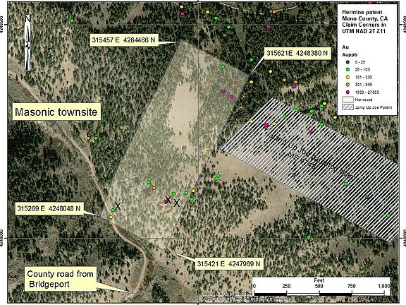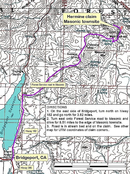 Deeded land (MS 4763, Mono County APN 009 020 001 000) contains 20.49 ac and is located north of Bridgeport CA. and just at the edge of the historic Masonic townsite. It is in the SW corner of section 15, T 6 N, R 26 E in Mono County California. A graded, county gravel road provides access to claim and it has lots of pinion pines and a seasonal stream. Rock samples collected from the old working on the claim contain more than 0.75 oz Au/ton. Great for prospecting or building a cabin. There is a large amount of historical data. Sales price $ 47,500