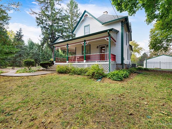 Established in the early 1900's, Historic Hartland Farm is a beautifully maintained Farmhouse on a 5-acre property surrounded by mature landscape! The insulated 36 x 32 pole barn includes heat, power, and tall doors for boats or campers. The dairy barn has been restored and now serves as a deep 3-car garage with a 2nd floor hayloft that boasts many possibilities with it's own generator & heater. The former "milk house" serves as a garden shed housing everything you'll need to maintain your large garden to grow your own fruits and vegetables! You'll be greeted by a charming wraparound front porch with refinished deck and freshly painted. Enter into the spacious living area with refinished Fir hardwood floor, classic crown moldings, chair rail, Solid 6 Panel Pine Doors, Pocket doors and Oak trim, a sunny parlor/family room then onto the dining room, new carpeting on the main floor up to the entire 2nd floor. The kitchen offers granite counters, stainless steel appliances, moveable butcher block top island and spacious pantry closet. A convenient mud room with new screen door leads you directly to the backyard! There is a main floor flex room/den and a full bath! The 2nd floor has a spacious loft and 3 generous bedrooms w/ample closet space and taller ceiling height with can lighting and an updated full bathroom with dual vanity! The basement has plenty of storage, an area for cold storage for all your garden canning and access to the yard. Recent improvements include New roof on the barn and house, New main line for sewage, electric updated in conduit, Huemann Kinetico sulfur/carbon filtration system, water softener, radon mitigation system, Thermopane windows with built in blinds between the glass, updated light fixtures in closets, freshly painted in many of the rooms, invisible fence roughed in and an abundance of fruit trees (pear and apple) grape arbor, berries and more. Backs to Martins Woods and within a short distance to the prairie trails! Truly a well maintained piece of history and a pleasure to show!