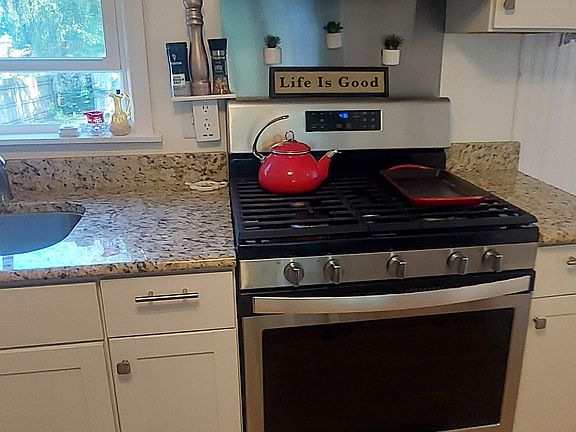 Granite countertops & stainless steel appliances with 5-burner gas stove & dishwasher