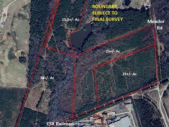 Ideal Industrial 1 zoning with CSX Railroad frontage >1/4 mile. Many uses for this great location. Thick young pines for privacy and great bedding area for whitetail deer. >700 Ft Frontage on Meador Rd. Meador Rd is a gated paved road for controlled access to this land. The small pines are easy to clear for farming or horses. Loamy soils are ideal for wildlife food plots or creating pastures. Additional 25-88 acres available for a total of 104 acres.