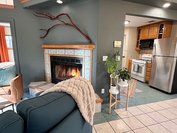 Living area has wood burning fireplace and new 4k 50" smart TV.