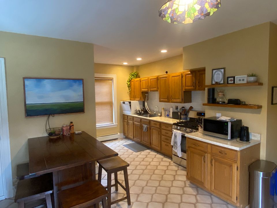 Spacious apartment (around 1100 square feet) on the first floor of a 2-family house in West Medford! Living room, two study areas, and eat-in kitchen with microwave, pantry and gas range. Great features, including built-in bookcases and china cabinet, ceiling fans, and bike storage. Window air conditioning unit. Gas heat. Free private laundry fir this unit in the building. Off-street parking for an additional cost. Shared yard and small private porch. Great location just 5-minute walk from the West Medford commuter rail stop, which is one stop away from North Station. 30-second walk to bus stop to the Green Line at Lechmere and the Red Line at Davis Square. Easily accessible to Tufts. Available NOW.