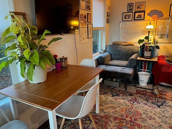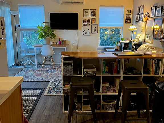The cottage has its own private entrance and back porch. The side area by cottage front door is free for use by tenant. Cottage is not attached to the main house but is attached to the garage (there is no entrance into guest house from garage though, just a shared wall). It's fully private. Cottage includes fridge, dishwasher, two cooking burners, microwave, w/d, shower, separate HVAC system, and large closet in bedroom. Two new ceiling fans recently installed. New flooring installed. Recently painted interior. New toilet. Heated tile floor in bathroom. Toaster oven included.