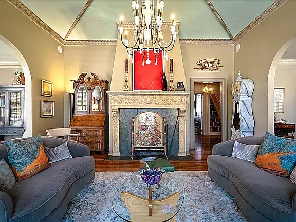 This unfurnished, exceptional Mediterranean style home combines the character and charm of a bygone era with thoughtful updates. An inviting, light-filled foyer leads to the stunning living room with floor to ceiling leaded windows, cathedral ceiling with rope trim and an intricately carved limestone fireplace. A state-of-the-art kitchen features custom cabinetry, Sub-Zero refrigerator and Thermador gas range. The spacious family room with wood-paneled vaulted ceiling and fireplace with custom mantel has French doors leading to a cozy sunroom with fireplace. The first floor primary bedroom and ensuite luxury shower boasts a 13x10 closet/dressing room. One additional bedroom on the 1st floor with a private guest wing. One upstairs bedroom with ensuite bath. Other features include wine cellar, outdoor porch with cooking area, and whole house generator. This lovely one of a kind home is nestled on a beautifully landscaped lot.