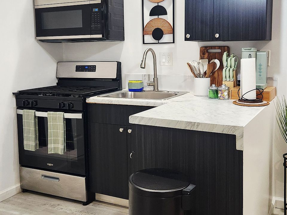 The kitchen is fully equipped with stainless steel appliances- refrigerator, microwave, range/oven, toaster oven, blender, coffee station, and more.