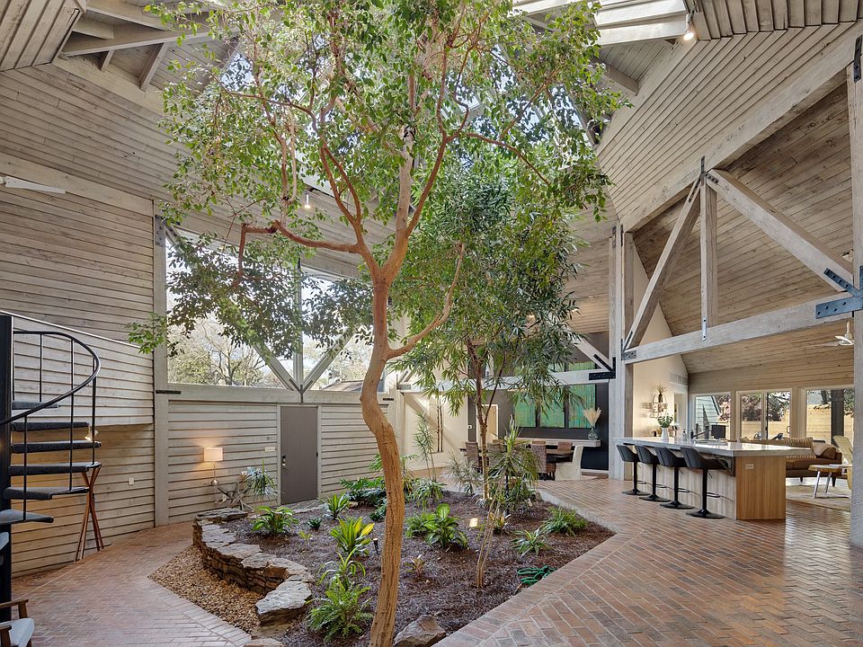 The spectacular soaring atrium with beautiful plantings that reach 30 feet in height is the focal point for this open-concept architectural wonder. You will be in awe of the massive timbers above, multi-level brick paver flooring, whimsical spiral staircases, pool oasis, gym, sauna, custom art and extravagant furnishings.