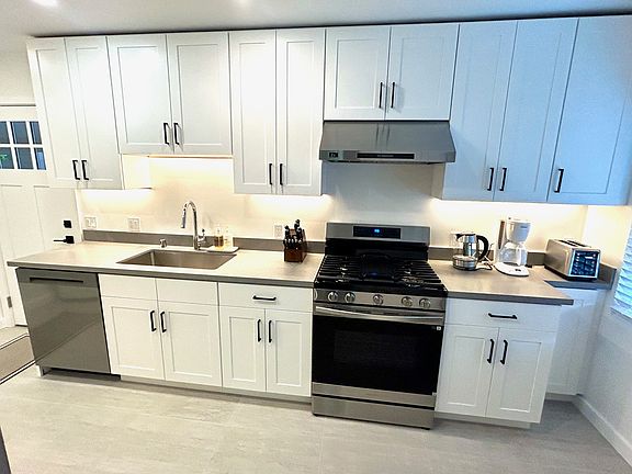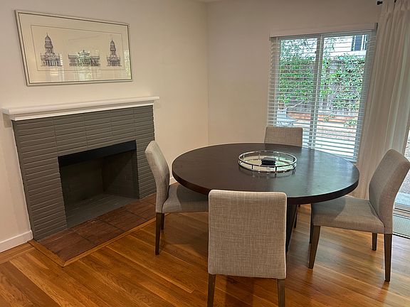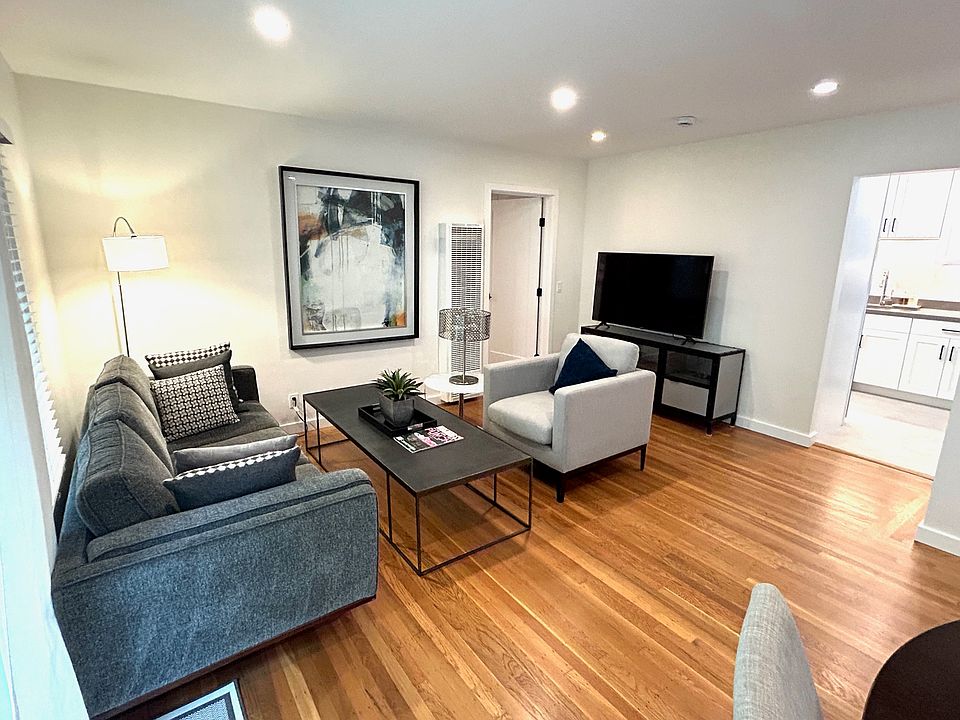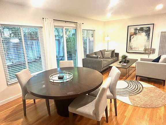This fully furnished 2 bedroom, 1Bath apartment has a shaded private yard and plenty of natural light. Completely remodeled, the apartment is an end unit, single story, with no shared walls with neighbors in a 3-unit building on a tree lined street in the Linfield Oaks neighborhood of Menlo Park. Back yard is private with small lawn and seating area.