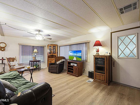 Financeable 1978 manufactured home on large culdesac lot w/many upgrades! Main roof recoated & exterior as well as carport recently painted. New LVP flooring t/o incl. large AZ room. Kitchen has newer cabinets & appliances incl washer-dryer & w/exception of refrigerator, are new. Windows have recently installed 90% shade screens & have upgraded window coverings. Many other upgrades. Super floorplan &this unit lives large!! Private culdesac location, large lot has multiple producing citrus trees & tons of potential! Owner will convey home as-is. Apache Wells is a unique active adult community composed of new site built & older manufactured homes. Close to both airports and all surface transportation! Fabulous amenities incl pickleball Cts. Must see! Low $68/month HOA.