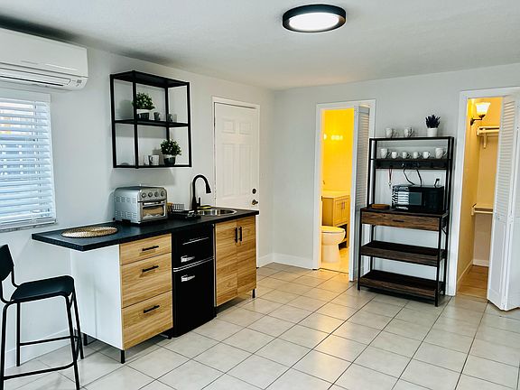 Close to Miami Airport (7th street and LeJeune. Separate Entrance on the side of the house with parking space available. Newly Remodeled with following features Kitchen Cabinets, Refrigerator, Microwave, Air Fryer / Oven, Curtains, All new lights, Semi-furnished with bed, nightstands, and armchair & stool by kitchen area.