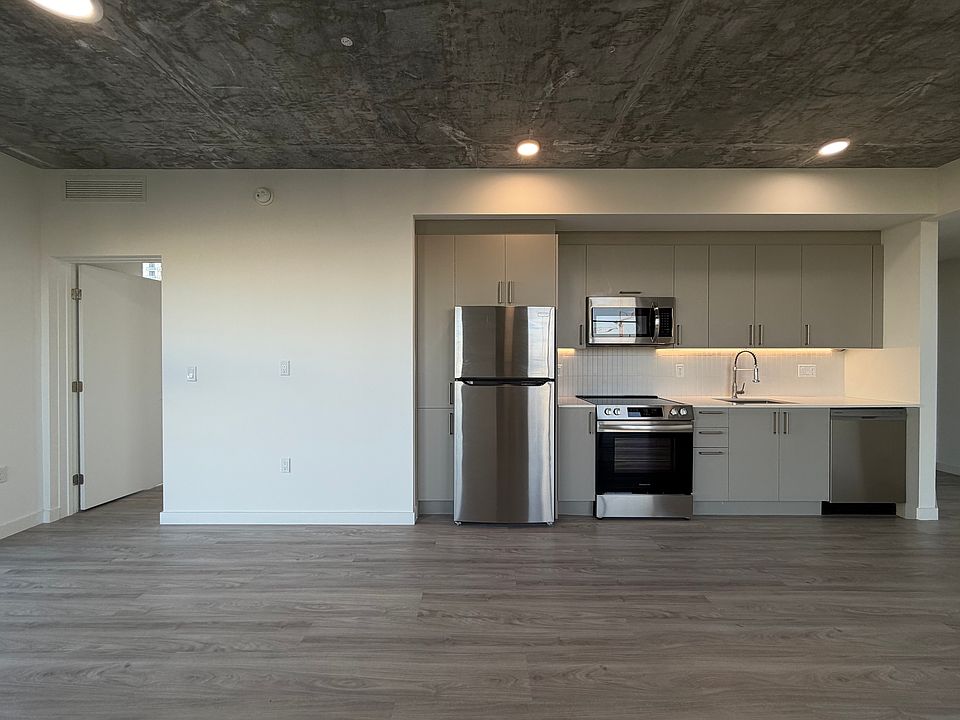 The 2 bedroom apartment features large windows that fill the space with natural light, a sleek open kitchen with stainless steel appliances, and a spacious bathroom with modern finishes. One of the standout features is the oversized private patio, offering open sky and beautiful downtown views perfect for relaxing, entertaining, or working outdoors.