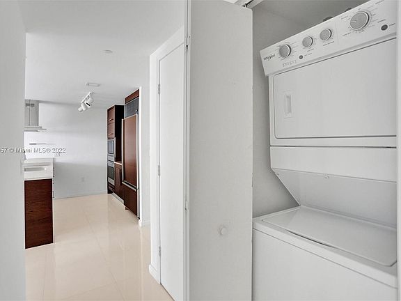Miami skylineItalian designer kitchenWhite porcelain tile floorsAdjacent waterfront parkWolf appliances