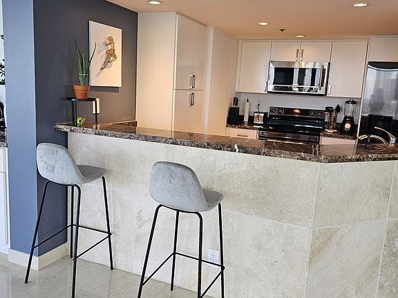 Granite countertopsPanoramic water viewsNew dishwasherIsland and marina viewCorner-unit condoMarble floorsFully equipped kitchen
