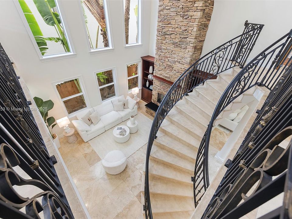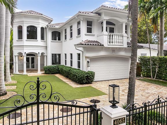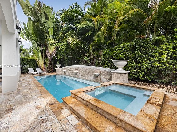 A gated Mediterranean-inspired retreat in South Coconut Grove, this two-story residence blends elegant design with seamless indoor-outdoor living. A dramatic central staircase anchors the open-plan main level, featuring a vaulted living room, formal dining, and a chef's kitchen with access to private outdoor terraces. The lush backyard offers a pool with fountains, spa, summer kitchen, and covered patio. Upstairs, the expansive primary suite boasts dual walk-ins, a spa bath, and a grand private terrace. Designer cabinetry, volume ceilings, and a voluminous second-floor living area complete this timeless Grove haven.