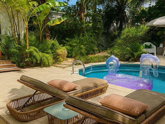 The true heart of this home is its lush tropical garden, designed to feel like a private jungle in the city. Towering palms, vibrant flowers, and cascading greenery surround a serene outdoor lounge area, creating an atmosphere of calm and connection with nature. Whether you're reading under the shade, hosting intimate dinners, or enjoying a morning coffee among the butterflies and birds, the garden offers a year-round tropical escape.