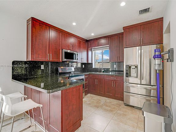 DO NOT KNOCK ON DOOR W/O APPOINTMENT, APPROVAL LETTER REQUIRED TO SET APPT * updated home with a modern theme ready to move in. This bright sunlit home features 3 bedrooms, 2 baths with an open living/dining area, a renovated kitchen with granite countertops and backsplash, and LG Stainless steel appliances. Spacious laundry room with white washer and dryer. Spacious backyard with a 15x30 beach entry saltwater swimming pool and a fast removal pool fence. Entire travertine backyard with fully cemented lateral sides for low maintenance, and a side entry impact windows and doors, with metal frame and glass thickness of 7/16, plus accordion shutters. Sewer pipes were replaced with PVC pipes (Cast iron pipes are prevalent in the area.