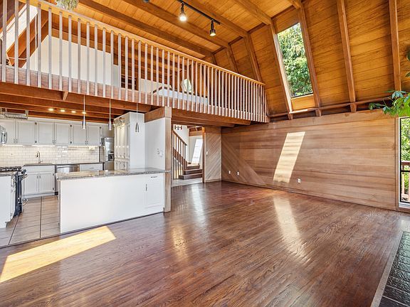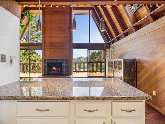 Inside, enjoy an open-concept great room with dramatic vaulted ceilings, two living rooms, and a bonus loft perfect for an office or creative space. Throughout the home, warm redwood-paneled walls and natural wood accents create a cozy, retreat-like atmosphere that mirrors the surrounding hills. The updated kitchen features stainless steel appliances and ample storage. The primary suite includes a walk-in closet and ensuite bath, with three additional large bedrooms offering treetop views and great closet space.