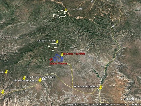 ''Beautiful Ranch Property'' between Mt Carmel Junction and the East Entrance of Zion National Park. Situated in the heart of some of the most magnificent scenery. This Lovely ''Old Ranch'' offers endless possibilities. It is comprised of 4 connecting parcels. Includes 50.6 shares of water which irrigates 12.656 acres. Property is in ''Green Belt''. Includes a 25 AUM permit. Access is approx 5 miles off Hwy 9 on a well maintained County Road. Property within a 1-2 hour drive to Bryce Canyon, the North Rim of the Grand Canyon and Lake Powell.
