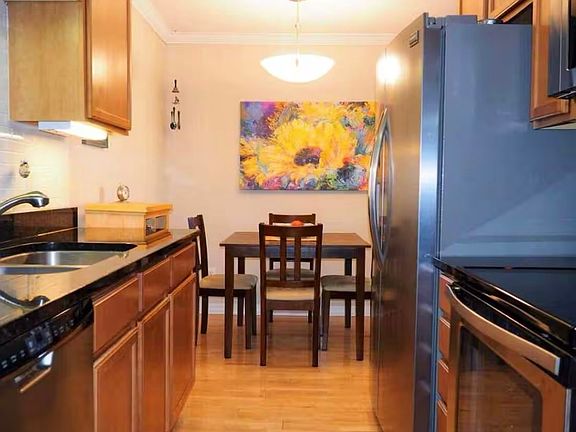 This sunny top level one bedroom condo has beautiful outdoor views and a sleek interior. Hardwood floors are throughout the entire unit. Newer stainless-steel appliances, window treatments, garbage disposal and more.