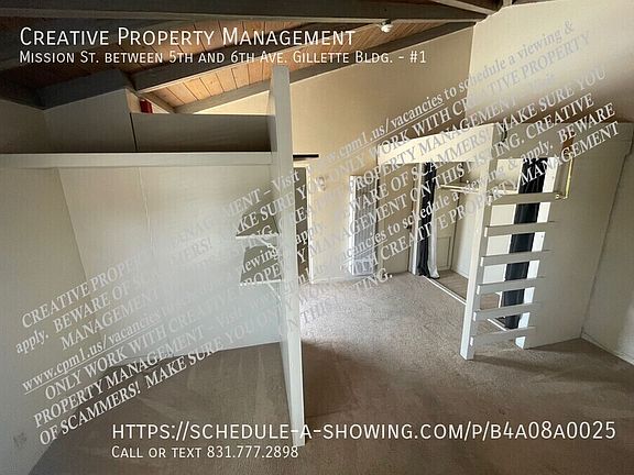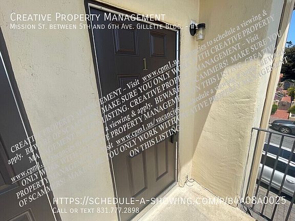 It is located between 5th & 6th Street on Mission Street across from Katy's Place Restaurant, above Travis Art Gallery, red stairs are behind.