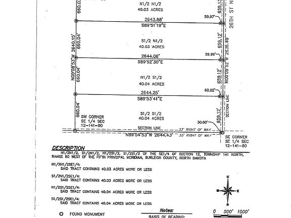 Pastureland zoned AG, small amount of tilled cropland - Lot of potential building sites, would make very nice hobby farms, property close to Bismarck - taxes, street address, and parcel number to be determined. Street address to be determined. Renters retain rights to cropland and pasture until 30th of November. 2023 . Each lot has a steel post painted orange located on the corner.