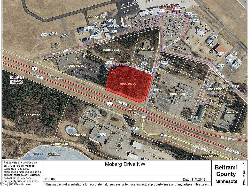 Commercial Development Opportunity: 6.3 acres at lighted intersection at the entrance of the Bemidji Airport! Situated at the NW corner of Highway 2 and Moberg Drive NW, this site offers outstanding visibility with traffic counts of 18,100vpd on the highway and over 3,599vpd on Moberg. Lot Dimensions: 630x470.