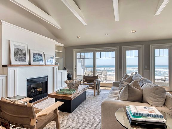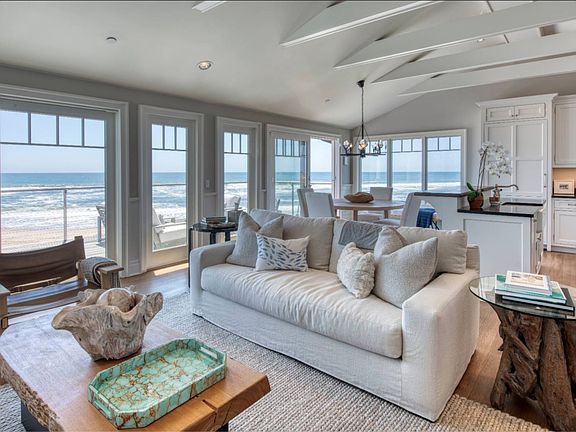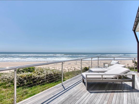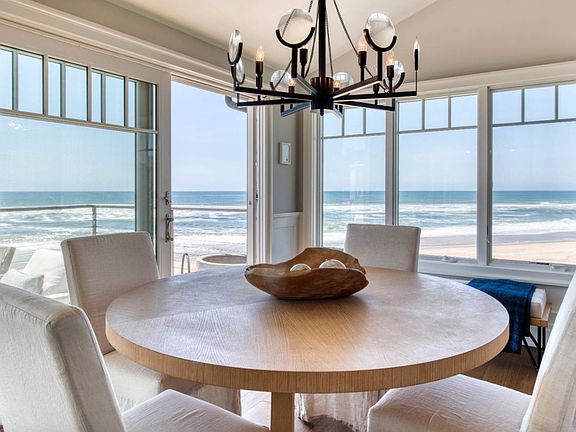 outdoors), presenting direct and unobstructed ocean views from every room. Enter to open, airy, light-filled living areas, with vaulted ceilings and a wall of floor to ceiling glass doors and windows showcasing dramatic panoramas of sea and sky and flowing out to an oceanfront terrace. Ideal for entertaining, the living area with fireplace, media and comfortable seating flows seamlessly to the well-equipped eat-in kitchen providing counter seating and high end stainless steel appliances. A formal dining area is immediately adjacent. The spacious first floor master suite has glass doors to a terrace, and features a walk-in closet and luxurious bath. A second bedroom suite, also with glass doors to the terrace, and a laundry room complete this level. Two more en-suite bedrooms with glass doors to a patio with a hot tub are located on the lower level. A private beach cabana and access to Gurney's fine dining venues and the Seawater Spa make this an amazing beach get-away.