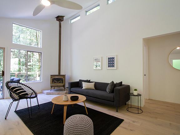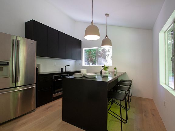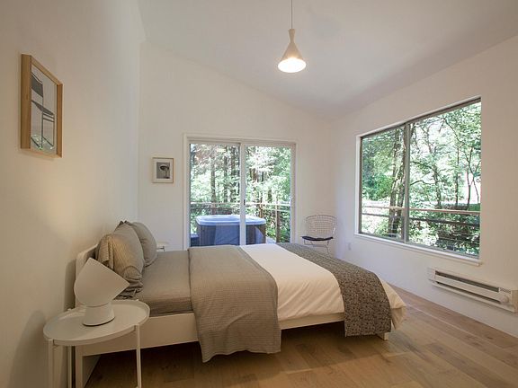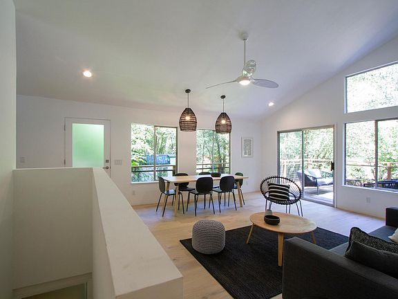 A modern renovated furnished (!) home in Monte Rio, Russian River. Come enjoy beautiful nature of redwood trees and private creek combined with a modern design full of light with high ceilings and large windows. 5 minutes drive from Russian River beach, 3 minutes drive from skate park and cafe, 7 minutes drive from down town Guerneville and 7 minutes drive from Downtown Occidental. The house has two floors. The top floor has a living room, kitchen two beddrooms, bathroom and large deck with a hot tub and sitting area. The lower level has a large family room, an office and a laundry room.