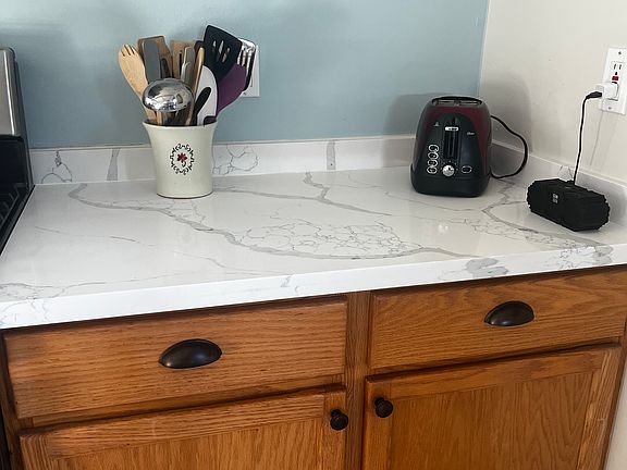 Kitchen with period charm, new quartz counter space, and adjacent dining nook