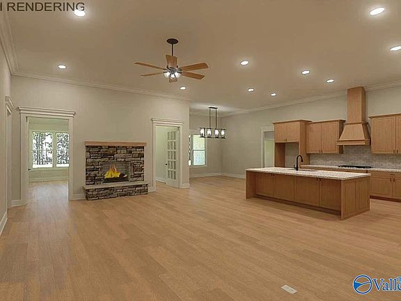 Proposed Construction-3-CAR GARAGE – NO CARPET – 12' CEILINGS – EXTENSIVE TRIM The Monticello B offers 4 bedrooms, 3 baths, formal dining & sunroom. Gourmet Kitchen features 12' ceilings, soft-close custom cabinetry w/ undercabinet lighting, granite, spacious island w/ seating & storage, gas cooktop w/ cabinet vent hood, tile backsplash & walk-in pantry. Family room has 12' ceilings, recessed lights, ceiling fan & gas-log fireplace. Dining room w/ coffered 12' ceiling. Primary suite includes double trey ceiling, recessed lighting, ceiling fan. Luxurious bath w/ freestanding tub, tile shower, frameless door & walk-in closet. Sunroom w/ 12' ceiling. Bedrooms w/ fans & crown. Wood shelving.