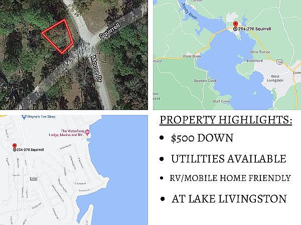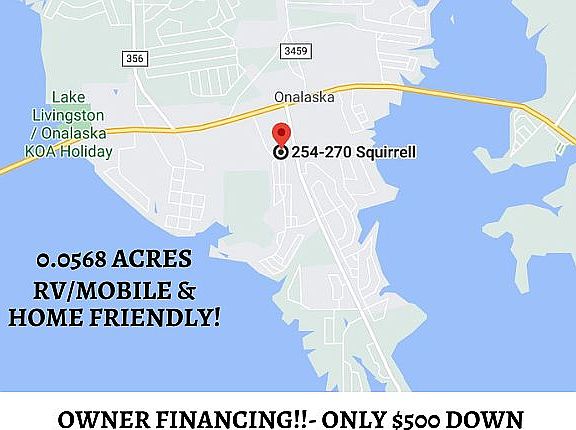 0.0569 Acres of RV/Mobile Home Friendly vacant land in Onalaska/near Lake Livingston. This property is perfect for you if you have an RV/mobile home OR you want property close to the lake. $4,900 with just $500 Down + $233.34/month for 21 months. Agents - Bring us a cash offer - We Pay a 5% commission! CALL/TEXT 314-710-2007 DIRECTLY FOR MOST RAPID RESPONSE! --- Property Information --- Acres: 0.0569 County: Polk State: TX Zip: 77360 GPS Coordinates: 30.8095, -95.1058 Utilities: Water-Electric-Sewer Available.