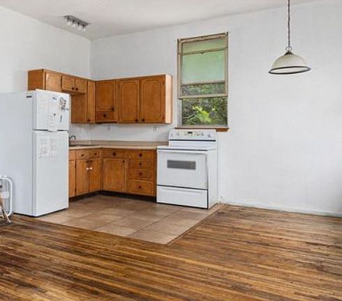 Upstairs 2-bedroom, 1-bath unit offering approximately 850 sq ft of living space. Features include 10-foot ceilings, an open-concept layout, hardwood flooring throughout with tile in the kitchen and bathroom.