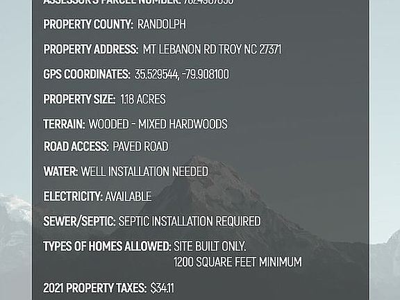 LAND FOR SALE - 1.18 acres with Electricity access in Troy, NC - Owner Financing Available! Discounted Cash Price: $15,900 1.18 acres of land for sale that is perfect for your modular or stick built home! This property is wooded and has power at the orad. A well and septic system will need to be installed. If you are looking for privacy and seclusion, this is the place for you! Just clear a section for your home! The address is MT Lebanon RD Troy, NC 27371. Enter the GPS coordinates into your GPS to locate the property: 35.529544, -79.908100. This land is just 25 minutes outside of Asheboro and 45 from Albemarle! This is a great opportunity to own some acreage in the next hot market of North Carolina! Owner financing available! Property Details Address: MT Lebanon RD Troy NC 27371 County: Randolph APN (Assessor’s Parcel Number): 7624987850 GPS Coordinates to locate property: 35.529544, -79.908100 Lot size: 1.18 Acres Type of Home(s) Allowed: Modular and Stick Built Home with at least 1200 square feet or more Sewer/Septic: septic installation needed Water: Well installation needed Electricity: Available Annual Property Tax: $34.11 **Deed restrictions apply: Please request a copy if interested! Food 19 minutes away Grocery 15 minutes away Pharmacy 18 minutes away Hospital 17 minutes away Charlotte 1 hour 25 minute drive Greensboro 45 minute drive Raleigh 1 hour 42 minute drive Fayetteville 1 hour 44 minute drive Make this property YOURS for a cash discounted price of $9,900! We are motivated to sell - All cash offers will be considered! Message, call, text or email us today to get started. We make it super easy for you! 980-277-1125 info@totallandhome.com Visit our Facebook page at www.facebook.com/properties.tlh to view all available properties! **As with any purchase of land, Buyer is responsible for verifying all information with the city/county as to what can and cannot be done with the property and confirm availability of any utilities/services for the property. Seller makes no warranties or representations about the land.