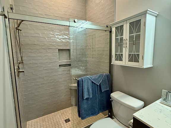 Modern cabinetryDesk with shelvingQuartz countertopsOver-bed storage cabinetRoomy closetLarge walk-in shower